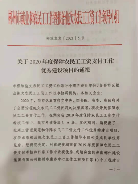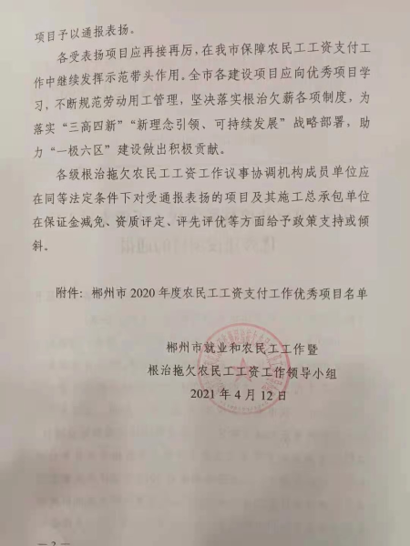 4月14日,中國(guó)二冶鋼構(gòu)分公司湖南永興一中項(xiàng)目獲得2020年度湖南省郴州市保障農(nóng)民工工資支付工作優(yōu)秀建設(shè)項(xiàng)目榮譽(yù)稱(chēng)號(hào)。