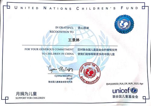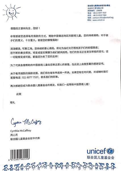 6月9日,聯(lián)合國(guó)兒童基金會(huì)致謝中國(guó)二冶優(yōu)秀青年員工王景林,對(duì)其多年來堅(jiān)持向聯(lián)合國(guó)兒童基金會(huì)捐款表示衷心感謝。