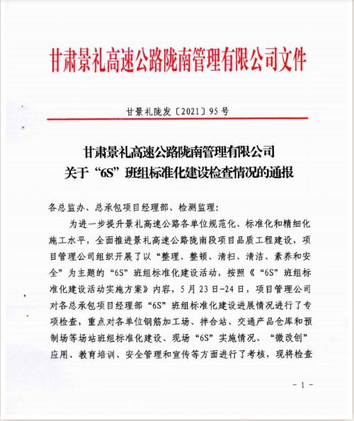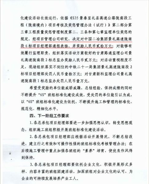 景禮項(xiàng)目部精心組織,合理安排,認(rèn)真組織實(shí)施。5月23日-24日,項(xiàng)目管理公司對各總承包項(xiàng)目經(jīng)理部“6S” 班組標(biāo)準(zhǔn)化建設(shè)進(jìn)展情況進(jìn)行了專項(xiàng)檢查,重點(diǎn)檢查了鋼筋加工場、拌合站、交通產(chǎn)品倉庫和預(yù)制場等場站班組標(biāo)準(zhǔn)化建設(shè)、現(xiàn)場“6S” 實(shí)施情況、“微 改創(chuàng)”應(yīng)用、教育培訓(xùn)、安全管理和宣傳等方面。依據(jù)《S35 景泰至禮縣高速公路隴南段工程(隴南境內(nèi))項(xiàng)目考核及獎懲管理辦法(試行)》第二部分第三章工程質(zhì)量獎懲管理制度第二、三條和第七章監(jiān)理單位獎懲的規(guī)定,經(jīng)項(xiàng)目管理公司研究,決定對中國二冶集團(tuán)景禮高速隴南段6標(biāo)項(xiàng)目經(jīng)理部通報表揚(yáng),并獎勵人民幣貳拾萬元。
