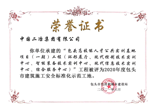 近日,從包頭市安監(jiān)站獲悉,中國二冶城建分公司實訓(xùn)基地項目被內(nèi)蒙古自治區(qū)包頭市住房和城鄉(xiāng)建設(shè)局評為2020年度包頭市建筑施工安全標(biāo)準(zhǔn)化示范工地。