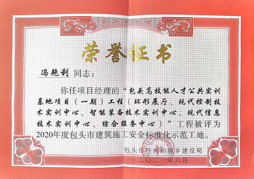 實訓(xùn)基地項目先后獲評中冶安全文明標(biāo)準(zhǔn)化工地、內(nèi)蒙古綠色建筑工地、“中施企協(xié)綠色建造評價”二星等多個安全文明類獎項,同時在2020年7月份組織的中國二冶集團(tuán)內(nèi)蒙古自治區(qū)片區(qū)“安全文明標(biāo)準(zhǔn)化”觀摩活動中獲得當(dāng)?shù)卣c集團(tuán)公司的一致好評。