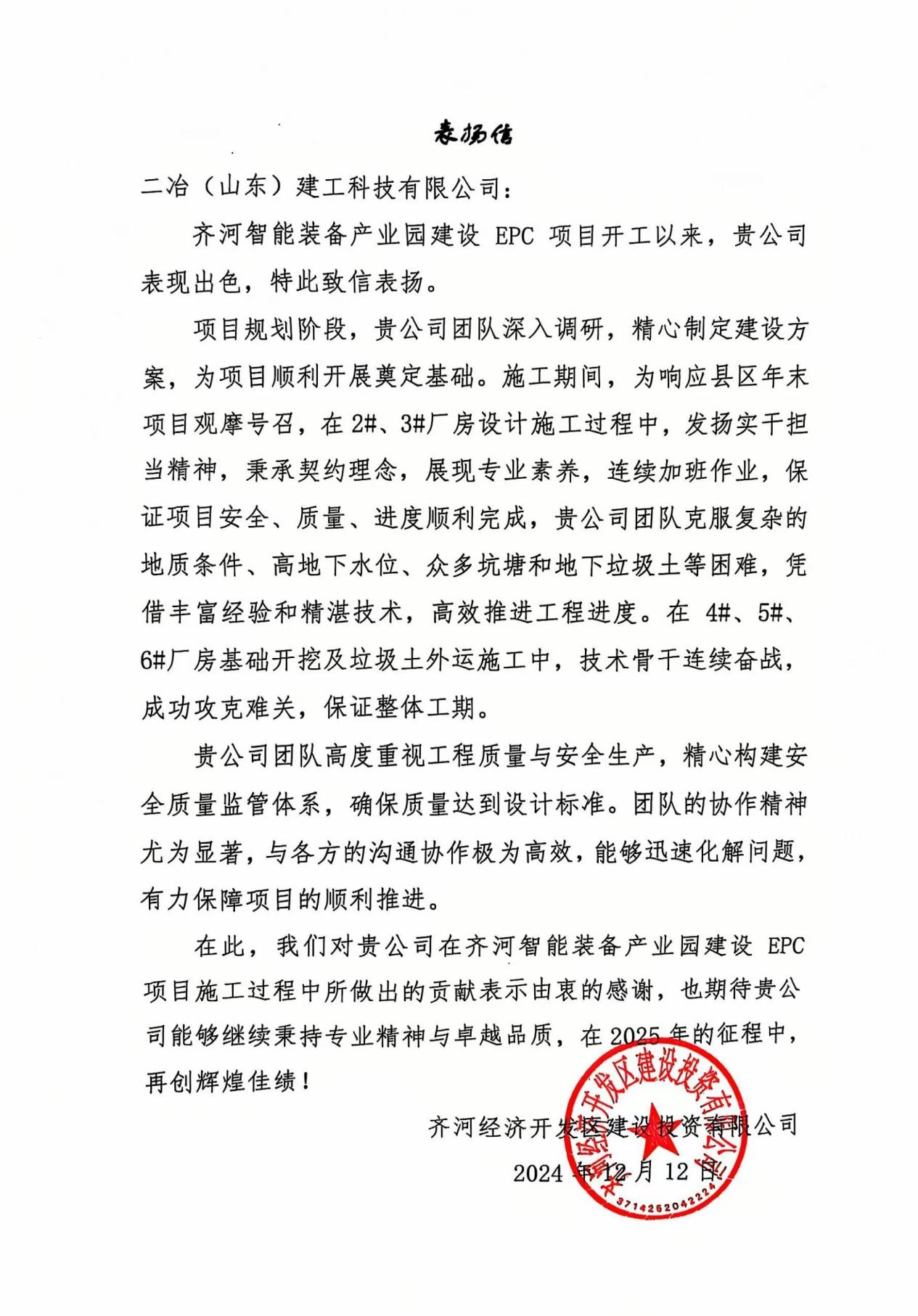 齊河縣經(jīng)濟(jì)開(kāi)發(fā)區(qū)建設(shè)投資有限公司的來(lái)信,對(duì)二冶(山東)建工科技有限公司在項(xiàng)目施工過(guò)程中的杰出貢獻(xiàn)表達(dá)了由衷的感激之情,并期望其在 2025 年繼續(xù)堅(jiān)守專(zhuān)業(yè)精神,保持卓越品質(zhì),再鑄輝煌佳績(jī)。