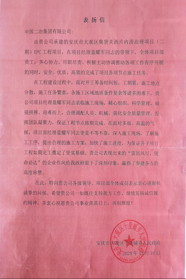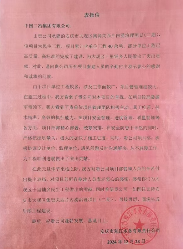近日,安慶市大觀區(qū)十里鋪鄉(xiāng)人民政府和安慶市觀江水務(wù)有限責(zé)任公司給中國(guó)二冶發(fā)來(lái)表?yè)P(yáng)信,對(duì)安慶市大觀區(qū)集賢關(guān)西片內(nèi)澇治理項(xiàng)目(二期)高質(zhì)量、高標(biāo)準(zhǔn)完成施工任務(wù)給予高度贊揚(yáng)。