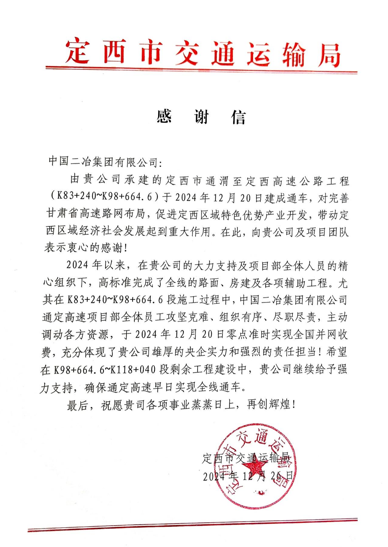定西市交通運(yùn)輸局在信中提到,12月20日,通定高速K83+240-K98+664.6標(biāo)段順利建成通車(chē),零點(diǎn)準(zhǔn)時(shí)實(shí)現(xiàn)全國(guó)并網(wǎng)收費(fèi),對(duì)于推動(dòng)定西市區(qū)域經(jīng)濟(jì)發(fā)展、優(yōu)化甘肅省交通網(wǎng)絡(luò)布局具有重要意義。今年以來(lái),中國(guó)二冶通定高速項(xiàng)目部攻堅(jiān)克難、組織有序、盡職盡責(zé),主動(dòng)協(xié)調(diào)資源,錨定通車(chē)目標(biāo),憑借精湛的技術(shù)實(shí)力、嚴(yán)格的質(zhì)量管理體系以及高效的團(tuán)隊(duì)協(xié)作能力高標(biāo)準(zhǔn)完成通車(chē)任務(wù),充分展現(xiàn)出央企的雄厚實(shí)力和強(qiáng)烈的責(zé)任擔(dān)當(dāng),愿中國(guó)二冶在項(xiàng)目剩余建設(shè)過(guò)程中給予大力支持,力爭(zhēng)早日實(shí)現(xiàn)全線通車(chē)目標(biāo)。