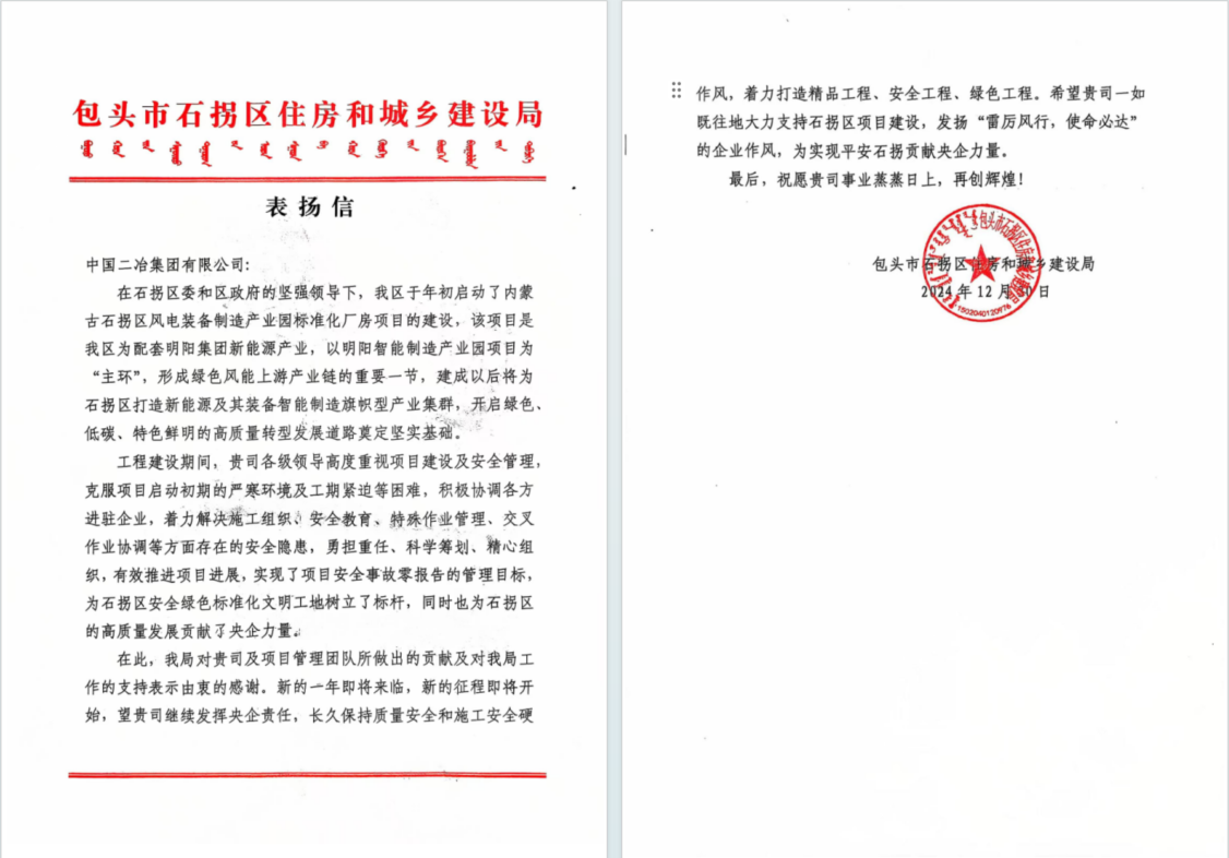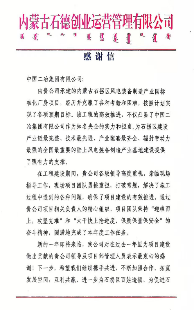 石拐區(qū)住建局在信中指出,內(nèi)蒙古石拐區(qū)風(fēng)電裝備制造產(chǎn)業(yè)園標(biāo)準(zhǔn)化廠房項目是石拐區(qū)為配套明陽集團(tuán)新能源產(chǎn)業(yè)形成綠色風(fēng)能上游產(chǎn)業(yè)鏈的重要項目,在工程建設(shè)期間,中國二冶各級領(lǐng)導(dǎo)高度重視項目建設(shè),項目管理克服項目啟動初期的嚴(yán)寒環(huán)境及工期緊迫等困難,勇?lián)厝?、科學(xué)籌劃、精心組織,有效推進(jìn)項目進(jìn)展,為石拐區(qū)的高質(zhì)量發(fā)展貢獻(xiàn)了央企力量。