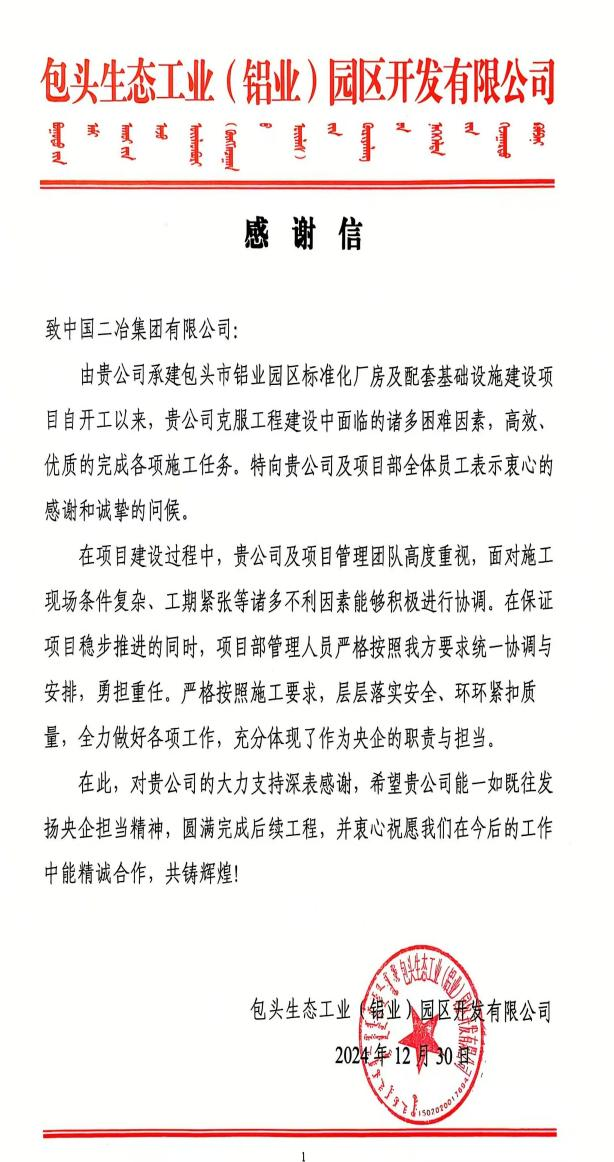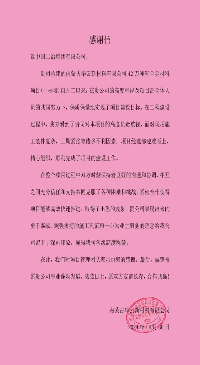 內(nèi)蒙古華云新材料有限公司在表揚(yáng)信中指出,由中國二冶承建的內(nèi)蒙古華云三期42萬噸輕合金材料項目,在貴公司的高度重視及項目部全體人員的共同努力下,保質(zhì)保量地實(shí)現(xiàn)了項目建設(shè)目標(biāo),贏得相關(guān)方的高度稱贊。