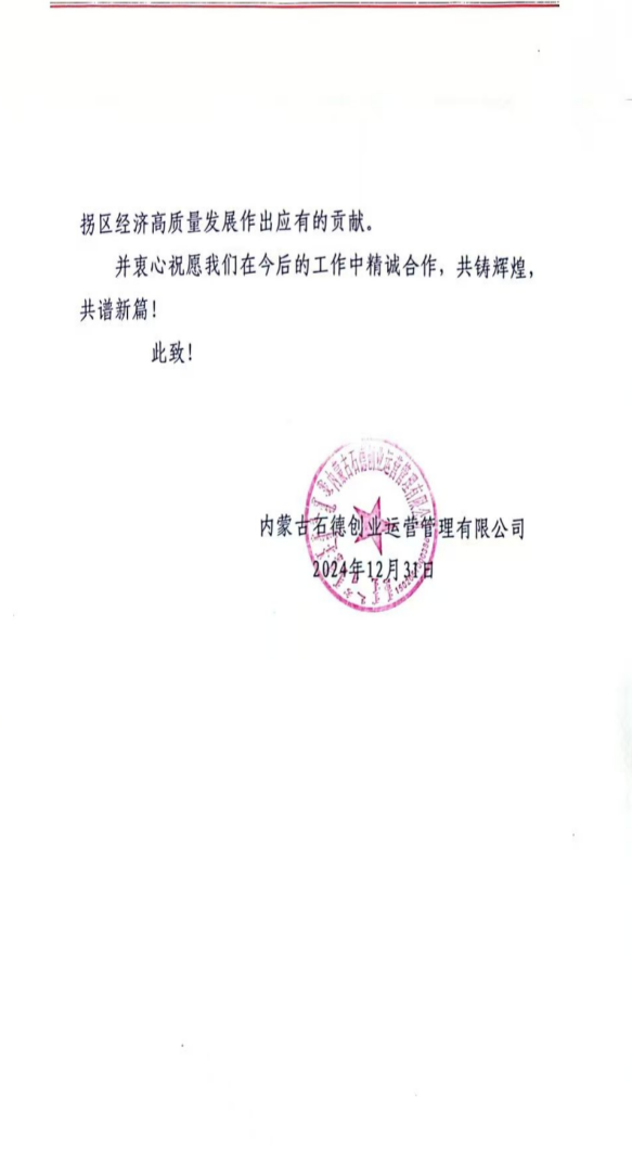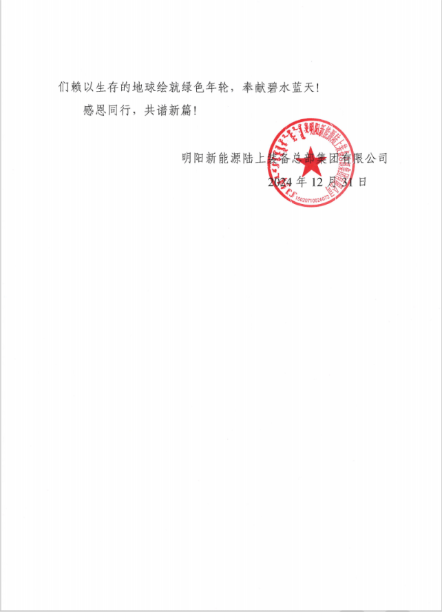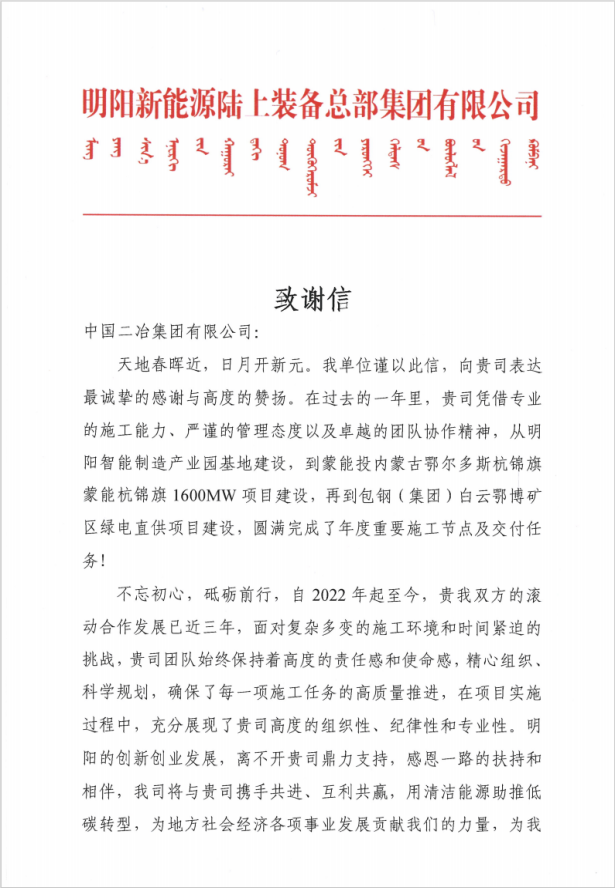 明陽智慧能源集團(tuán)股份公司在感謝信中指出,2024年,貴司憑借專業(yè)的施工能力、嚴(yán)謹(jǐn)?shù)墓芾響B(tài)度以及卓越的團(tuán)隊協(xié)作精神,從明陽智能制造產(chǎn)業(yè)園基地建設(shè),到蒙能投內(nèi)蒙古鄂爾多斯杭錦旗蒙能杭錦旗1600兆瓦項目建設(shè),再到包鋼(集團(tuán))白云鄂博礦區(qū)綠電直供項目建設(shè),圓滿完成了年度重要施工節(jié)點(diǎn)及交付任務(wù)。
