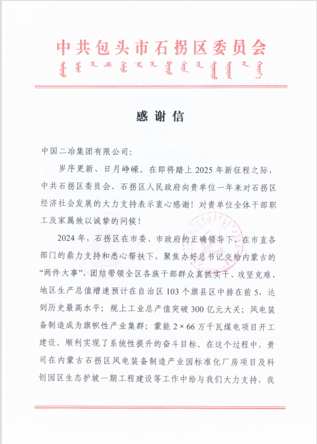 信中指出,2024年,石拐區(qū)在市委、市政府的正確領(lǐng)導(dǎo)下,在市直各部門的鼎力支持和悉心幫扶下,聚焦辦好習(xí)近平總書(shū)記交給內(nèi)蒙古的“兩件大事”,團(tuán)結(jié)帶領(lǐng)全區(qū)各族干部群眾真抓實(shí)干、攻堅(jiān)克難,地區(qū)生產(chǎn)總值增速預(yù)計(jì)在自治區(qū)103個(gè)旗縣區(qū)中排在前5,達(dá)到歷史最高水平;規(guī)上工業(yè)總產(chǎn)值突破300億元大關(guān);風(fēng)電裝備制造成為旗幟性產(chǎn)業(yè)集群;蒙能2×66萬(wàn)千瓦煤電項(xiàng)目開(kāi)工建設(shè)。順利實(shí)現(xiàn)了系統(tǒng)性提升的奮斗目標(biāo)。在這個(gè)過(guò)程中,中國(guó)二冶在內(nèi)蒙古石拐區(qū)風(fēng)電裝備制造產(chǎn)業(yè)園標(biāo)準(zhǔn)化廠房項(xiàng)目及科創(chuàng)園區(qū)生態(tài)護(hù)坡一期項(xiàng)目等工程建設(shè)中給予大力支持,我們銘記在心、深懷感激。明年是“十四五”規(guī)劃的收官之年,也是石拐區(qū)爬坡過(guò)坎、站上新的歷史臺(tái)階的關(guān)鍵一年。我們將繼續(xù)堅(jiān)持以習(xí)近平新時(shí)代中國(guó)特色社會(huì)主義思想為指導(dǎo),認(rèn)真貫徹落實(shí)上級(jí)各項(xiàng)部署要求,以永不懈怠的精神狀態(tài)和一往無(wú)前的奮斗姿態(tài),凝心聚力、團(tuán)結(jié)拼搏,奮力實(shí)現(xiàn)歷史性跨越的奮斗目標(biāo)。