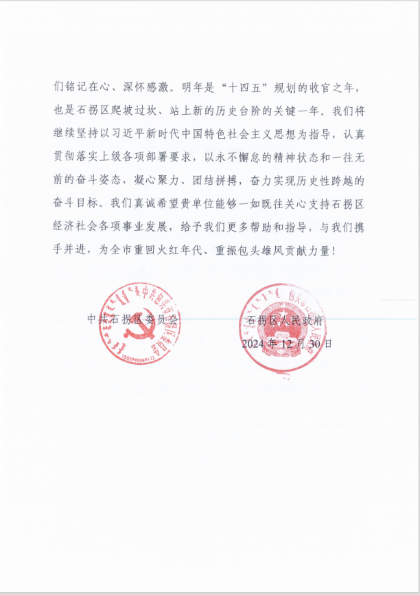 信中最后,石拐區(qū)政府真誠(chéng)希望中國(guó)二冶能夠一如既往關(guān)心支持石拐區(qū)經(jīng)濟(jì)社會(huì)各項(xiàng)事業(yè)發(fā)展,給予石拐區(qū)更多幫助和指導(dǎo),并攜手并進(jìn),為全市重回火紅年代、重振包頭雄風(fēng)貢獻(xiàn)力量!