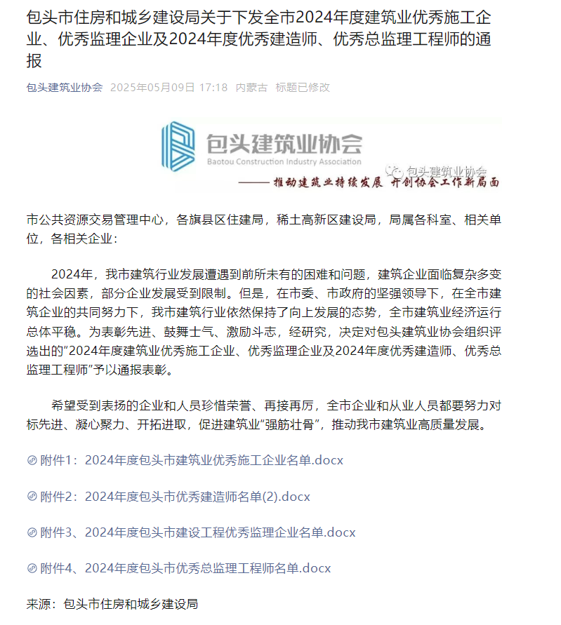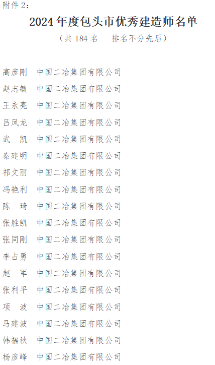 近日,包頭市住房和城鄉(xiāng)建設(shè)局通報表彰了全市2024年度建筑業(yè)優(yōu)秀施工企業(yè)、優(yōu)秀監(jiān)理企業(yè)及2024年度優(yōu)秀建造師、優(yōu)秀總監(jiān)理工程師。中國二冶獲評“2024年度包頭市建筑業(yè)優(yōu)秀施工企業(yè)”,同時30名職工獲評2024年度包頭市優(yōu)秀建造師,為公司榮譽(yù)榜再添佳績。