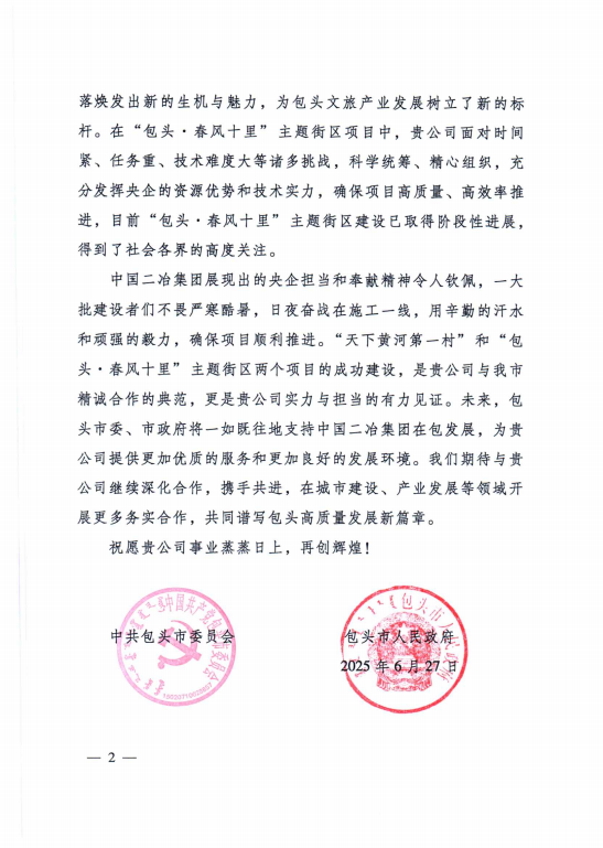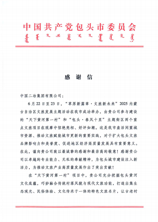 6月30日,中國二冶收到包頭市委、市政府發(fā)來的表揚信,對中國二冶在“天下黃河第一村”和“包頭?春風(fēng)十里”兩大重點文旅項目建設(shè)中作出的卓越貢獻(xiàn),給予高度贊譽(yù)。?
