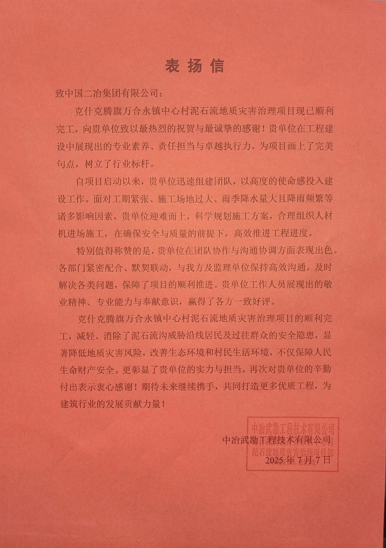 表揚(yáng)信中特別肯定了項(xiàng)目部各部門緊密配合、協(xié)同高效,與業(yè)主及監(jiān)理單位始終保持順暢、高效的溝通,及時(shí)響應(yīng)并有效解決現(xiàn)場(chǎng)出現(xiàn)的各類問題,為項(xiàng)目的順利推進(jìn)提供了堅(jiān)實(shí)保障,贏得了項(xiàng)目各方的一致好評(píng)。信中強(qiáng)調(diào),該項(xiàng)目的順利完工,充分彰顯了中國(guó)二冶在復(fù)雜地質(zhì)環(huán)境治理領(lǐng)域的強(qiáng)大技術(shù)實(shí)力和作為央企的使命擔(dān)當(dāng),為地質(zhì)災(zāi)害治理領(lǐng)域樹立了標(biāo)桿。