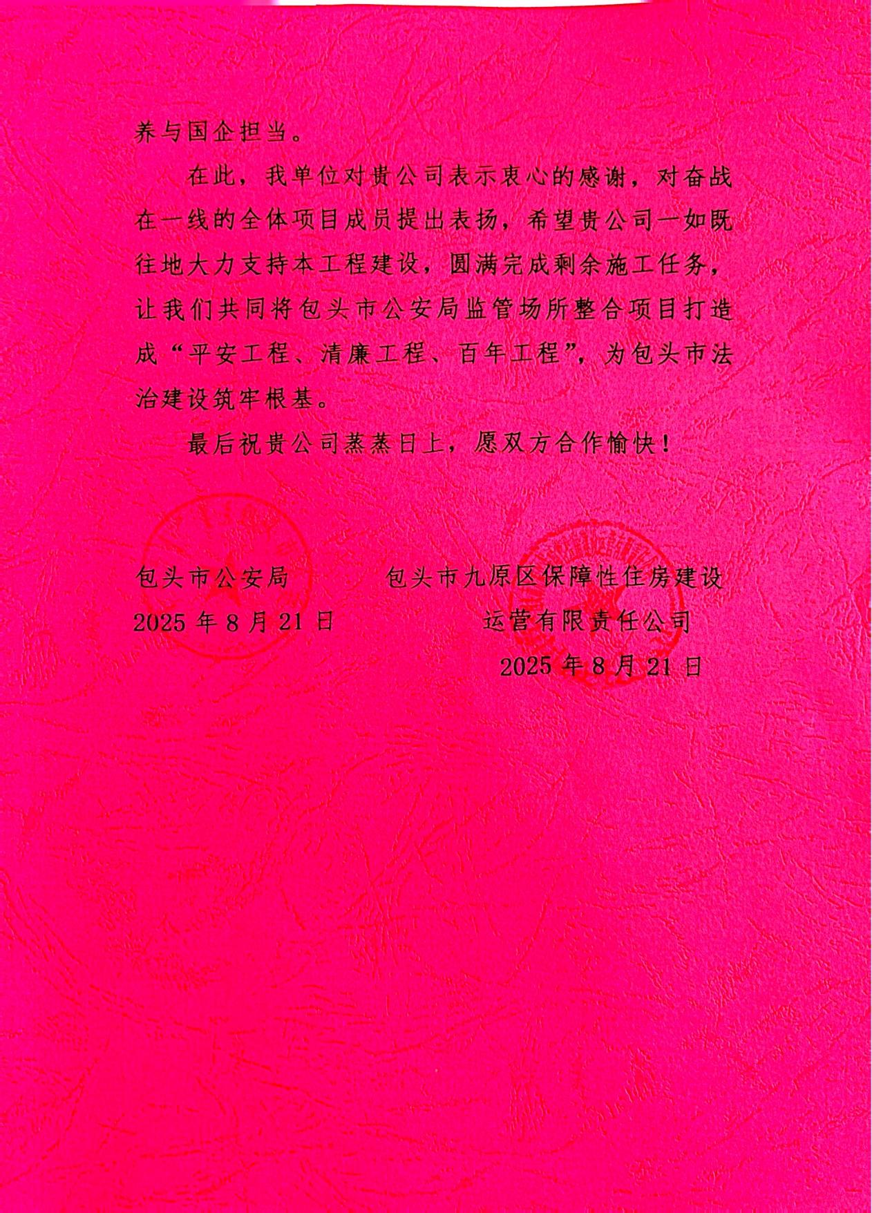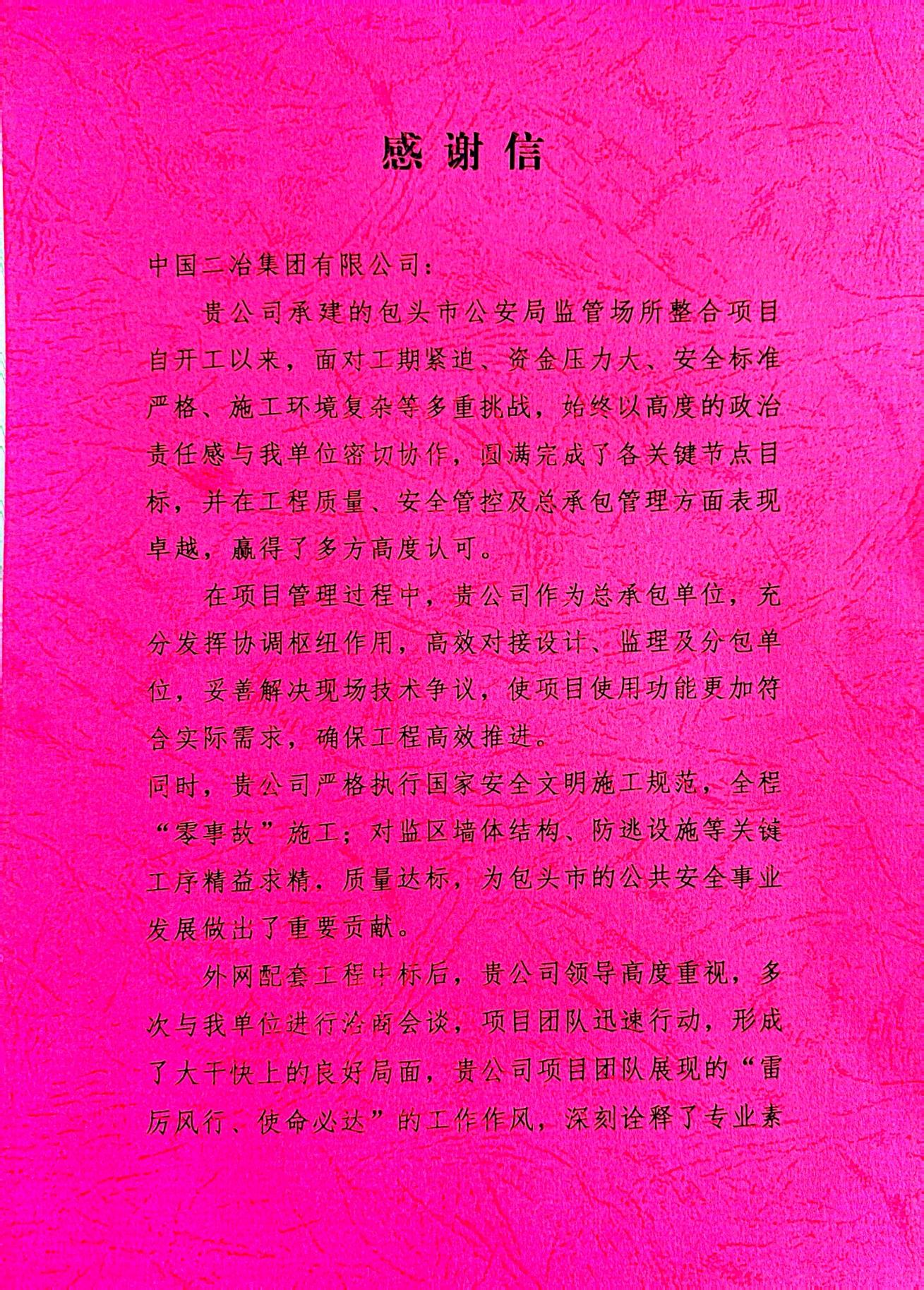信中指出,貴公司作為總承包單位,充分發(fā)揮協(xié)調(diào)樞紐作用,高效對接設(shè)計(jì)、監(jiān)理及分包單位,妥善解決現(xiàn)場技術(shù)爭議,使項(xiàng)目使用功能更加符合實(shí)際需求,確保工程高效推進(jìn)。同時(shí)嚴(yán)格執(zhí)行國家安全文明施工規(guī)范,全程“零事故”施工;對監(jiān)區(qū)墻體結(jié)構(gòu)、防逃設(shè)施等關(guān)鍵工序精益求精,質(zhì)量達(dá)標(biāo),為包頭市的公共安全事業(yè)發(fā)展做出了重要貢獻(xiàn)。今年,在外網(wǎng)配套工程中標(biāo)后,貴公司第一時(shí)間響應(yīng),相關(guān)領(lǐng)導(dǎo)高度重視,多次與我單位進(jìn)行洽商會(huì)談,項(xiàng)目團(tuán)隊(duì)迅速行動(dòng),人、材、機(jī)第一時(shí)間到位,形成了大干快上的良好局面,項(xiàng)目團(tuán)隊(duì)展現(xiàn)的 “超越自我、挑戰(zhàn)極限”的作風(fēng),以及使命必達(dá)的執(zhí)行力,深刻詮釋了專業(yè)素養(yǎng)與國企擔(dān)當(dāng)。