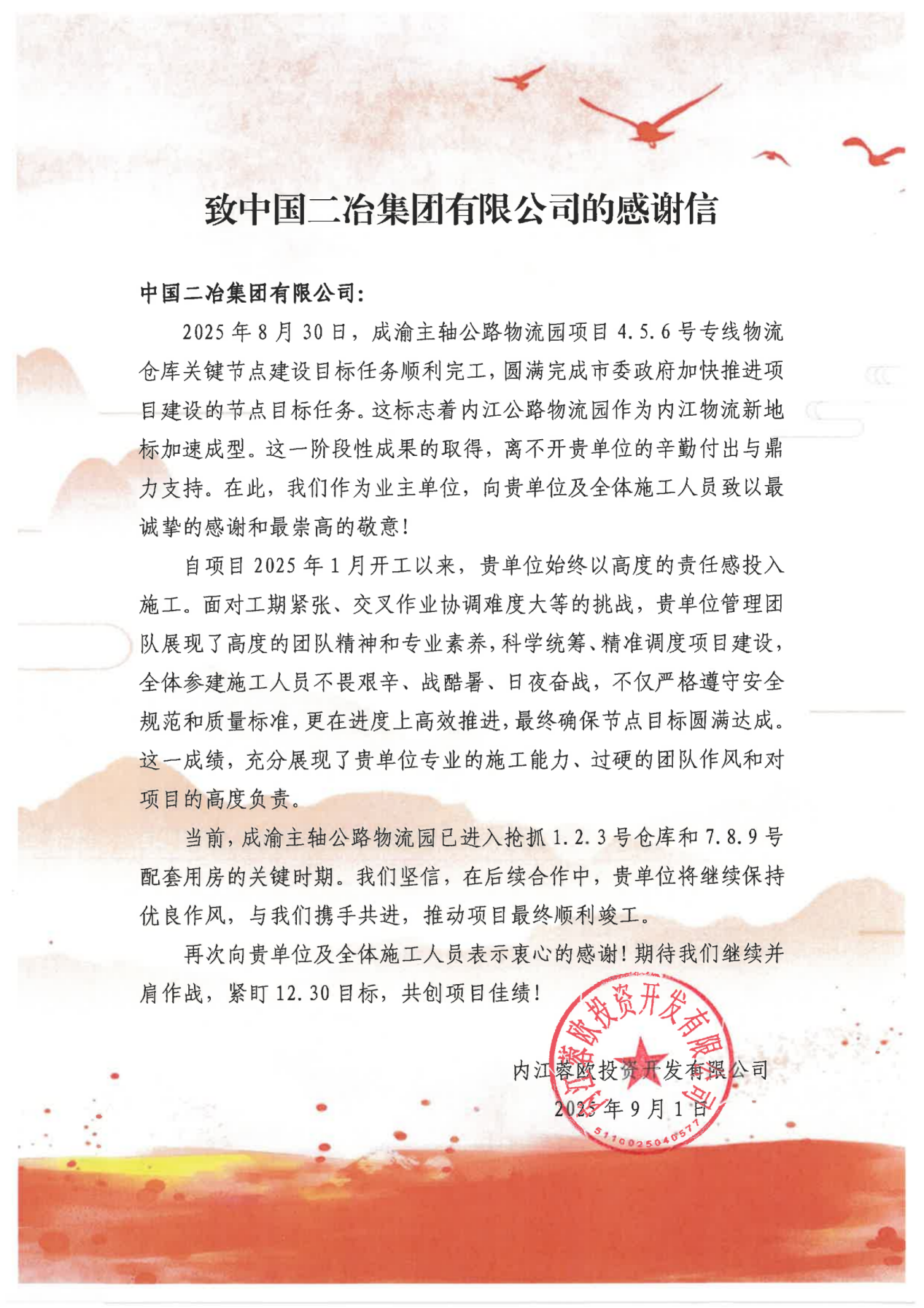此封表?yè)P(yáng)信不僅是對(duì)中國(guó)二冶項(xiàng)目團(tuán)隊(duì)的卓越表現(xiàn)的高度認(rèn)可,更是對(duì)中國(guó)二冶整體企業(yè)精神和綜合實(shí)力的有力肯定。這封信件不僅彰顯了中國(guó)二冶在復(fù)雜工程項(xiàng)目中的專業(yè)管理能力和高效執(zhí)行力,還體現(xiàn)了對(duì)合作伙伴關(guān)系的深度重視,進(jìn)一步提升了企業(yè)在行業(yè)內(nèi)的聲譽(yù)和影響力,為后續(xù)項(xiàng)目合作注入了強(qiáng)大動(dòng)力。