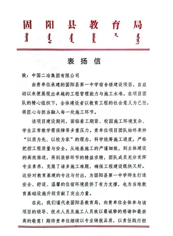 此次表揚(yáng)信不僅是對(duì)項(xiàng)目團(tuán)隊(duì)的認(rèn)可,更是對(duì)中國(guó)二冶品牌實(shí)力的彰顯。公司將繼續(xù)傳承“堅(jiān)韌不拔,勇攀高峰”的精神,在民生工程與教育基建領(lǐng)域持續(xù)發(fā)力,以專業(yè)能力踐行社會(huì)責(zé)任,為城市的發(fā)展建設(shè)貢獻(xiàn)力量。