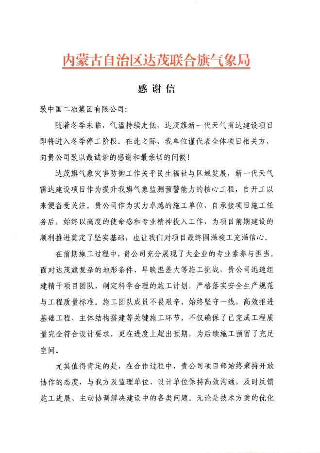 11 月 16 日,中國二冶收到內蒙古自治區(qū)達茂聯(lián)合旗氣象局發(fā)來的感謝信,信中對公司在達茂旗新一代天氣雷達建設項目施工中的專業(yè)表現(xiàn)與辛勤付出給予高度肯定,并致以誠摯感謝。