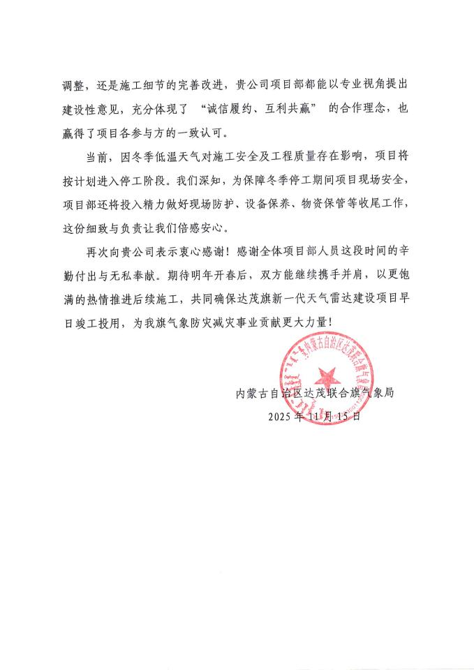 合作期間,項目部始終秉持開放協(xié)作態(tài)度,與氣象局、監(jiān)理單位及設計單位建立高效溝通機制,及時反饋施工進展,主動協(xié)調解決建設中的各類問題。同時,在技術方案優(yōu)化、施工細節(jié)完善等方面積極提出建設性意見,切實踐行 “誠信履約、互利共贏” 的合作理念,贏得了項目各參與方的一致認可。針對冬季低溫天氣對施工安全及工程質量的影響,項目部還細致部署現(xiàn)場防護、設備保養(yǎng)、物資保管等冬季停工收尾工作,盡顯嚴謹負責的工作態(tài)度。 此次感謝信的送達,極大鼓舞了項目部全體人員的士氣,既是對中國二冶高質量管理與實干擔當?shù)某浞终J可,也為團隊注入了強勁動力。