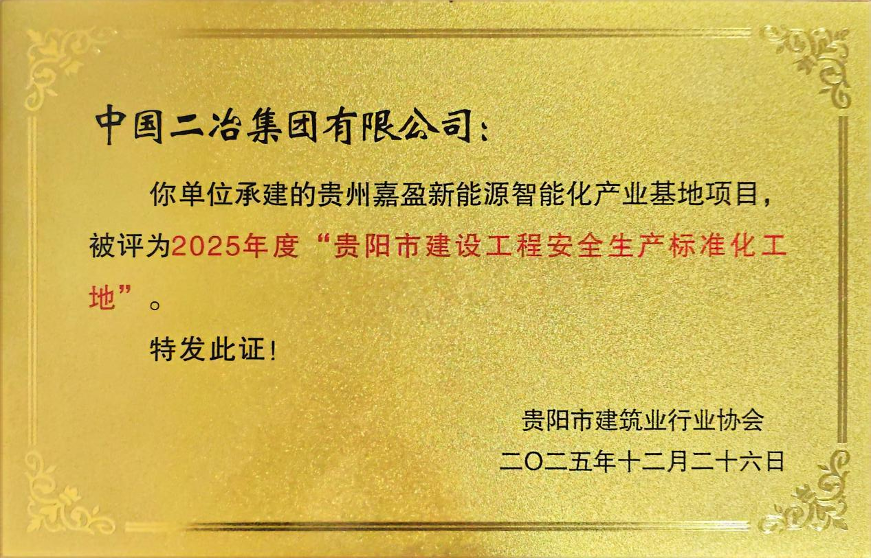 近日,中國(guó)二冶貴州嘉盈新能源智能化產(chǎn)業(yè)基地項(xiàng)目榮獲貴陽市建筑業(yè)行業(yè)協(xié)會(huì)頒發(fā)2025年度“貴陽市建設(shè)工程安全生產(chǎn)標(biāo)準(zhǔn)化工地”獎(jiǎng)項(xiàng)。
