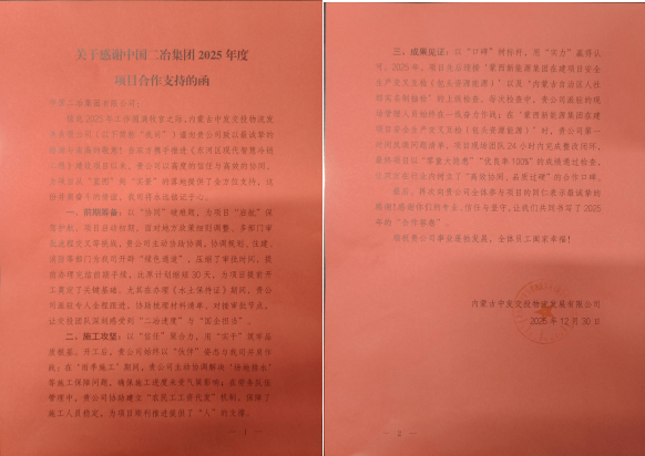 信中還指出,在施工攻堅階段,貴公司始終以“伙伴”姿態(tài)與交投團隊并肩作戰(zhàn),在雨季施工中,貴公司主動協(xié)調(diào)解決場地排水等施工保障問題,確保工程進度未受氣候影響;在勞務(wù)隊伍管理中,貴公司協(xié)助建立“農(nóng)民工工資代收”機制,保障了施工人員穩(wěn)定,為項目順利推進提供“人”的支撐。在安全環(huán)保檢查中,貴公司派駐的現(xiàn)場管理人員始終在一線奮力作戰(zhàn),第一時間反饋問題清單,項目現(xiàn)場團隊24小時內(nèi)完成整改閉環(huán),最終項目以“零重大隱患”“優(yōu)良率100%”的成績通過檢查,為雙方在行業(yè)內(nèi)樹立了“高效協(xié)同、品質(zhì)過硬”的合作口碑,以“口碑”樹標桿,用“實力”贏得認可。