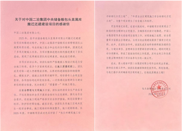 業(yè)主方期待中國二冶團隊在后續(xù)建設(shè)中繼續(xù)保持優(yōu)良作風(fēng),攜手打造優(yōu)質(zhì)精品工程。這封表揚信不僅是對項目團隊的肯定,更是對中國二冶品牌實力與企業(yè)精神的認可。中國二冶將持續(xù)秉持誠信履約、精益建造的理念,全力保障項目圓滿竣工。