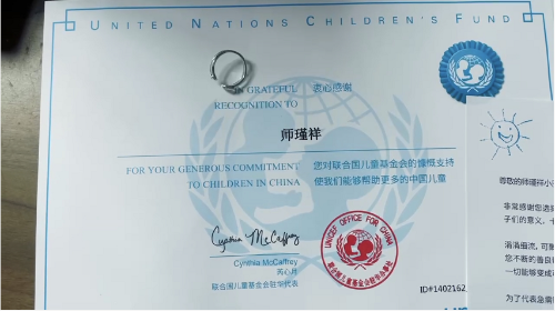 對于參與聯(lián)合國兒童基金會計劃項目捐款這件事,師瑾祥并沒有刻意宣揚(yáng),作為項目技術(shù)員,他每個月寫新聞報道公司都有稿費(fèi),拿到稿費(fèi)的師瑾祥并沒有想著如何去消費(fèi),而是想到了曾經(jīng)在瀏覽網(wǎng)站時,看到過聯(lián)合國兒童基金會官方舉行的月捐項目,他毫不猶豫地將這筆稿費(fèi)捐贈給了聯(lián)合國中國偏遠(yuǎn)地區(qū)困境兒童。從那時開始,他就與聯(lián)合國兒童基金會捐款項目結(jié)下了不解之緣。從2021年4月到現(xiàn)在,累計向該項目捐款6次1200元。一次次無心的善意,沒想到9月后收獲了饋贈,這封來自聯(lián)合國兒童基金會的感謝信、榮譽(yù)證書和榮譽(yù)戒指讓師瑾祥充滿了喜悅。這一枚用可回收材料制作的紀(jì)念戒指,既是對善心善舉的紀(jì)念,更是對其向善愛心的褒揚(yáng)。貢獻(xiàn)雖小但長久,戒指很輕,也很重。