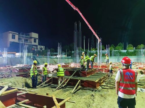 在4#廠房混凝土澆筑期間,夜已很深,陰雨連綿,但是施工現(xiàn)場依舊燈火通明,管理人員施工口令陣陣,運(yùn)輸車輛源源不斷,各種機(jī)械聲不絕于耳,構(gòu)成了一幅壯觀的“挑燈夜戰(zhàn)圖”……面對(duì)緊張的節(jié)點(diǎn)工期、繁重的任務(wù)目標(biāo),在這沒有硝煙的戰(zhàn)場上,項(xiàng)目上下正進(jìn)行著一場場與時(shí)間賽跑的攻堅(jiān)戰(zhàn),各施工作業(yè)班組人員采取“緊密配合,見縫插針,立體交叉”的勞動(dòng)形式,快馬加鞭,攻堅(jiān)克難,全力推進(jìn)項(xiàng)目建設(shè),有效地保障了工程進(jìn)度。