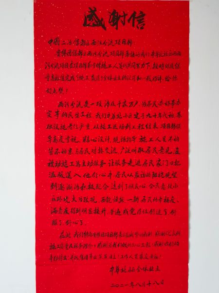 項(xiàng)目負(fù)責(zé)人盧晨表示:“感謝信是居民對(duì)邢臺(tái)項(xiàng)目部工作的肯定,也傳達(dá)出老舊小區(qū)雨污水分流改造帶給居民的幸福感和獲得感。”