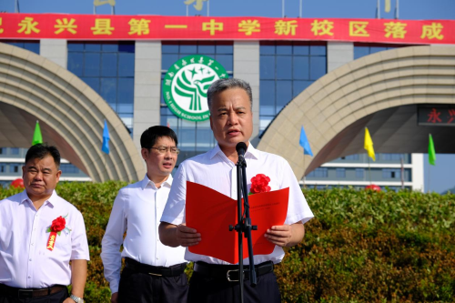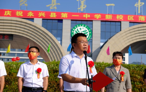 揭牌儀式首先由永興一中校長(zhǎng)胡兆文致辭。他指出,永興一中項(xiàng)目建設(shè)是造福當(dāng)?shù)匕傩盏囊豁?xiàng)重大民生工程,是功在當(dāng)代,利在千秋的一件大事。他希望學(xué)生們心懷天下做有家國(guó)情懷的人,意志堅(jiān)韌做積極進(jìn)取的人,心胸開闊做陽光大度的人,心存善意做助人為樂的人。最后,他祝學(xué)生們?cè)谛碌膶W(xué)??鞓烦砷L(zhǎng)。