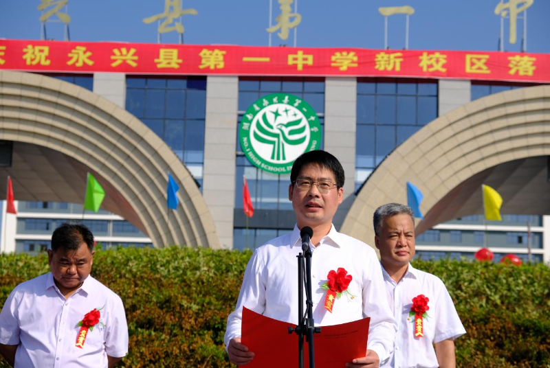 劉朝暉在致辭中首先代表縣委、縣人大、縣政府、縣政協(xié),向夜以繼日奮戰(zhàn)的中國(guó)二冶施工人員、項(xiàng)目指揮部工作人員和承建單位表示衷心感謝!廣大建設(shè)者克服了重重困難,歷經(jīng)了千辛萬苦,全體參與項(xiàng)目建設(shè)的同志們發(fā)揚(yáng)“三牛”精神,吃苦耐勞,攻堅(jiān)克難,奮戰(zhàn)1300多個(gè)日日夜夜,終于建成了一座占地400畝、學(xué)位6000個(gè)的現(xiàn)代化新高中,向全縣人民兌現(xiàn)了莊嚴(yán)承諾,也讓70萬永興人民充分感受到縣委縣政府致力于改善民本民生的堅(jiān)定決心。他強(qiáng)調(diào),優(yōu)質(zhì)教育質(zhì)量的均衡發(fā)展一直是困擾當(dāng)?shù)乜h鄉(xiāng)兩級(jí)教育事業(yè)發(fā)展的一個(gè)難題。今天新校區(qū)的揭牌意味著永興一中即將揚(yáng)帆遠(yuǎn)航,永興一中要以揭牌和開學(xué)為新起點(diǎn),瞄準(zhǔn)高標(biāo)準(zhǔn),高質(zhì)量,高品位目標(biāo),提高教育質(zhì)量,辦出教育品牌,努力把學(xué)校創(chuàng)辦成管理一流,特色鮮明的義務(wù)教育標(biāo)桿學(xué)校。