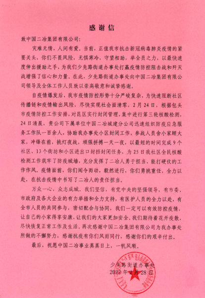 2月28日,包頭市昆區(qū)少先路街道辦事處致中國二冶感謝信,表揚中國二冶在抗擊新冠病毒肺炎疫情的緊要關頭,不畏艱險,無懼寒冷,齊心協(xié)力,共抗疫情,展現(xiàn)了中國二冶愛民為民、守土盡責、扛鼎重擔、召之必來,來之必戰(zhàn)的擔當與奉獻,特向中國二冶干部職工致以崇高敬意和衷心感謝!
