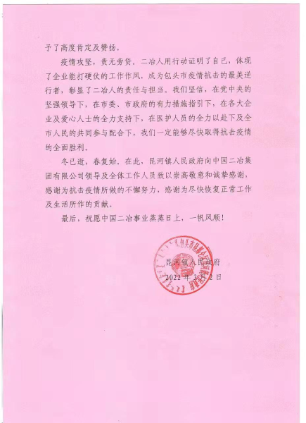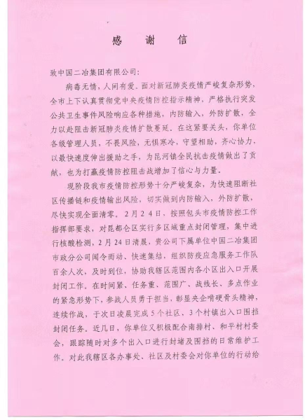 3月2日,昆河鎮(zhèn)人民政府向中國(guó)二冶發(fā)來(lái)感謝信,對(duì)中國(guó)二冶在全市全力阻擊新冠肺炎疫情擴(kuò)散蔓延的緊要關(guān)頭,不畏風(fēng)險(xiǎn),無(wú)懼寒冷,守望相助,齊心協(xié)力,以最快速度為昆河鎮(zhèn)快速阻斷社區(qū)傳播鏈和疫情輸出風(fēng)險(xiǎn)所做出的貢獻(xiàn),對(duì)央企快速反應(yīng)、雷厲風(fēng)行的工作作風(fēng)表示感謝。