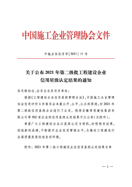 6月28日,工程建設(shè)行業(yè)信用體系建設(shè)平臺(tái)(中施企協(xié)信用字【2021】11號(hào))發(fā)布2021年第二批工程建設(shè)企業(yè)信用星級(jí)認(rèn)定結(jié)果,中國二冶獲得“工程建設(shè)企業(yè)信用星級(jí)18星級(jí)”。